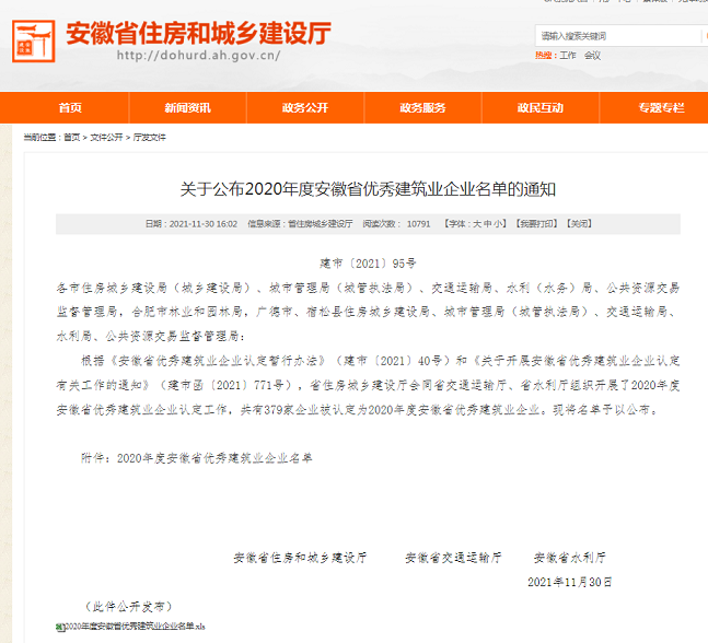 據悉,本次評優是由安徽省住房和城鄉建設廳、省交通運輸廳、省水利廳首次聯合開展的全省優秀建筑業企業認定評選活動,安徽省優秀建筑業企業稱號是對我省建筑業企業綜合實力的認定。