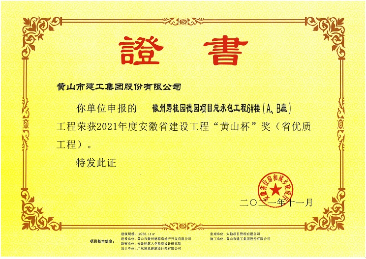 由黃山建工集團承建的徽州區碧桂園德園項目總承包工程6#樓(A、B座) 工程榮獲安徽省工程質量最高獎“黃山杯”獎。該工程在開工伊始,項目部就制訂了創優目標,嚴格過程控制,建立健全項目質量管理體系,狠抓現場施工管理,把好施工過程質量控制關,為創精品工程打下堅實的基礎。