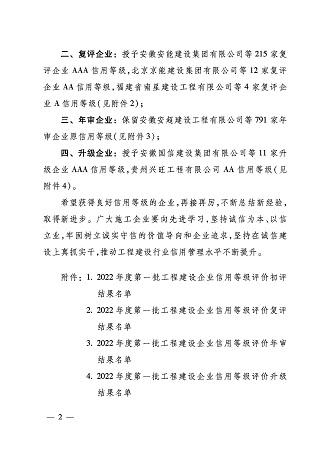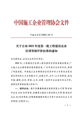 2022年,黃山市建工集團(tuán)股份有限公司再次榮獲施工企業(yè)最高信用評(píng)級(jí)“AAA級(jí)企業(yè)信用證書”。這是對(duì)黃山市建工集團(tuán)股份有限公司持續(xù)積累的經(jīng)營(yíng)管理能力、合同履約能力、市場(chǎng)競(jìng)爭(zhēng)能力及優(yōu)質(zhì)社會(huì)形象的權(quán)威認(rèn)證。