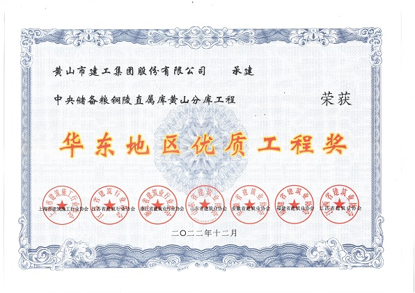 由黃山建工集團股份有限公司承建的“中央儲備糧銅陵直屬庫黃山分庫工程”榮獲華東地區各省建筑業協會聯合頒發的“華東地區優質工程獎”。