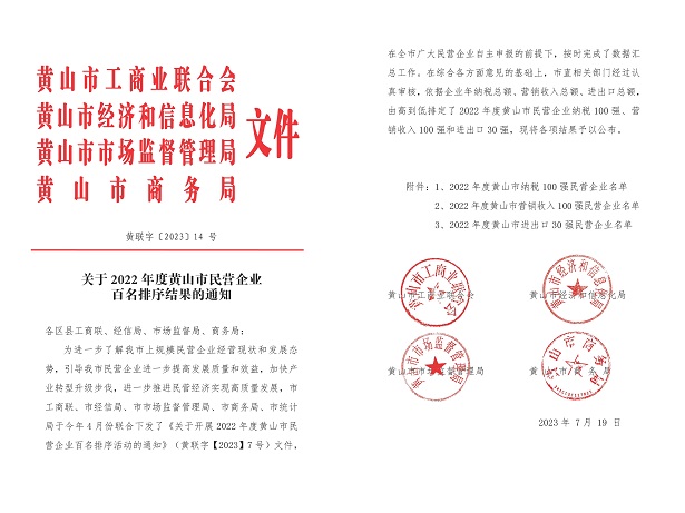 日前,由黃山市工商聯(lián)、市經(jīng)信局、市監(jiān)管局及市商務局聯(lián)合發(fā)布2022年度黃山市民營企業(yè)納稅及營銷收入百強名單公布,黃山建工集團連續(xù)多年再次實力入圍,獲此殊榮!
